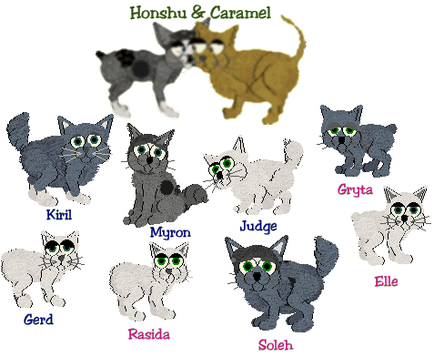 Blue and white, anyone? Judge, Kiril, Myron and Soleh are Bobtails, the rest have Russian Blue personalities.