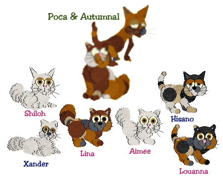 I like the black and orange :) Socorra has a Fold personality; Antoine, Ayala and Georgianna are Calicos; the rest have Siamese personalities.